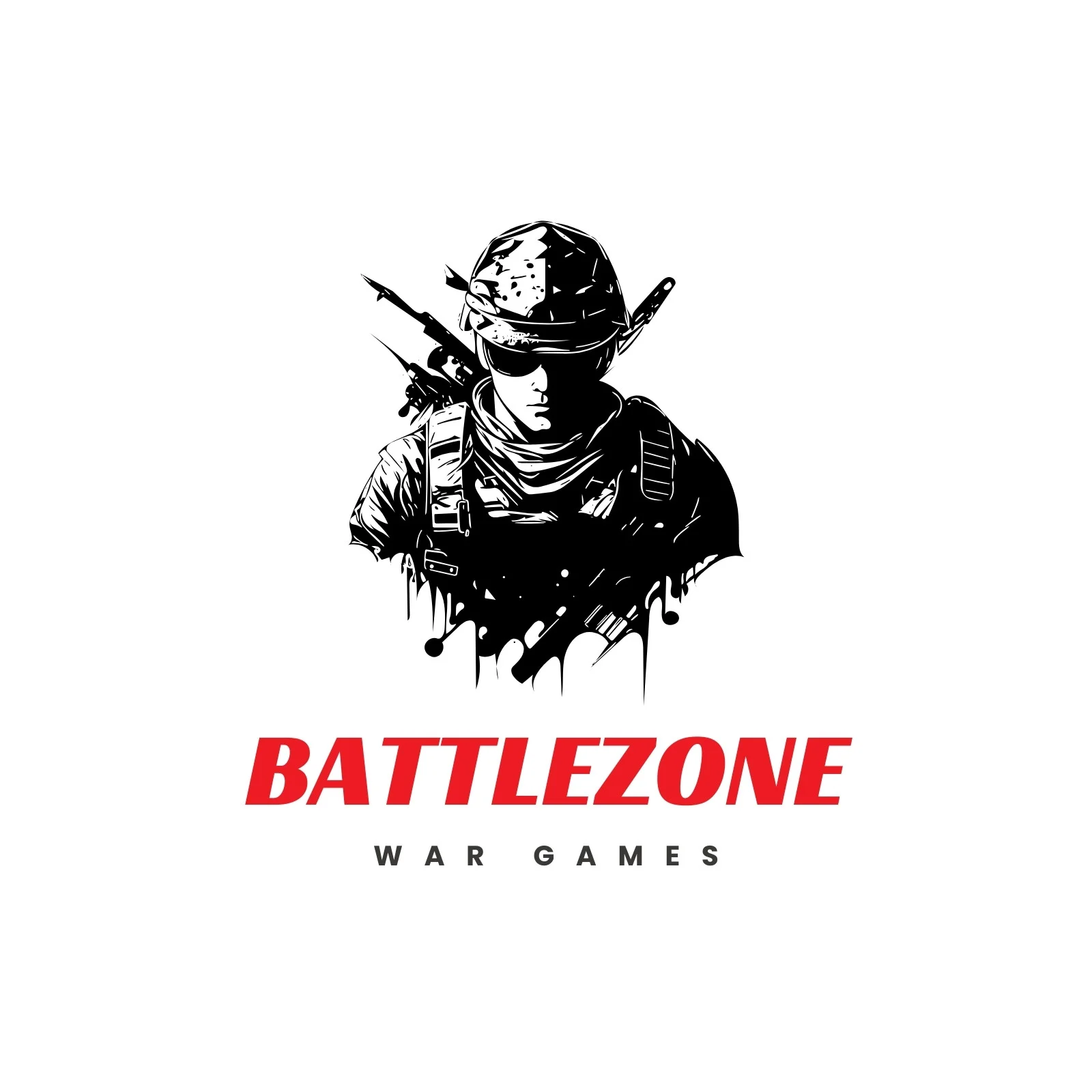 A bold, high-impact logo featuring a tactical soldier illustration that embodies strength, strategy, and action. Designed for a war-themed gaming brand, the sharp contrasts and dynamic typography create an intense visual identity.