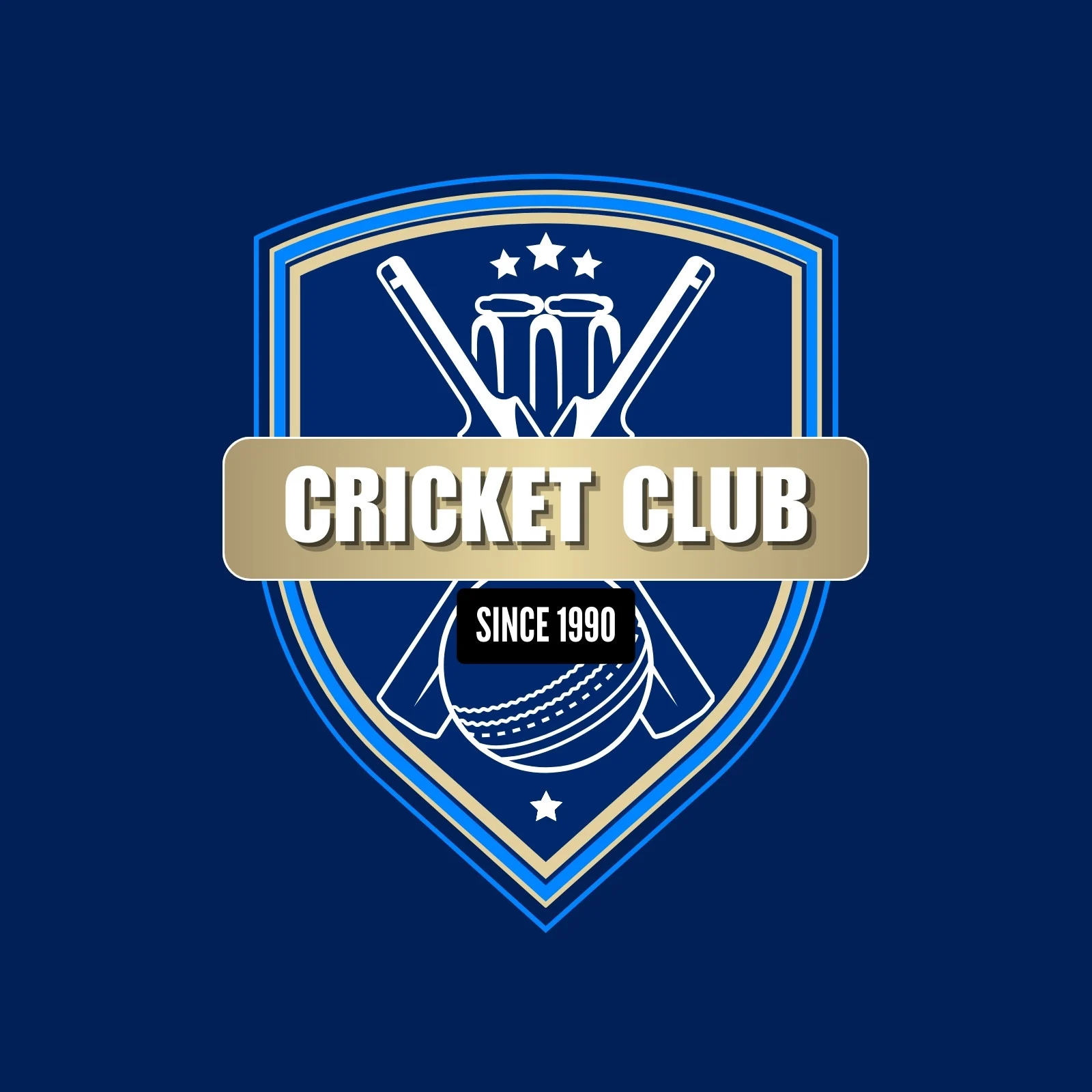 A classic shield-style logo created for a cricket club, combining traditional cricket elements with a modern gold-accented design. The badge highlights legacy with "Since 1990" proudly displayed.