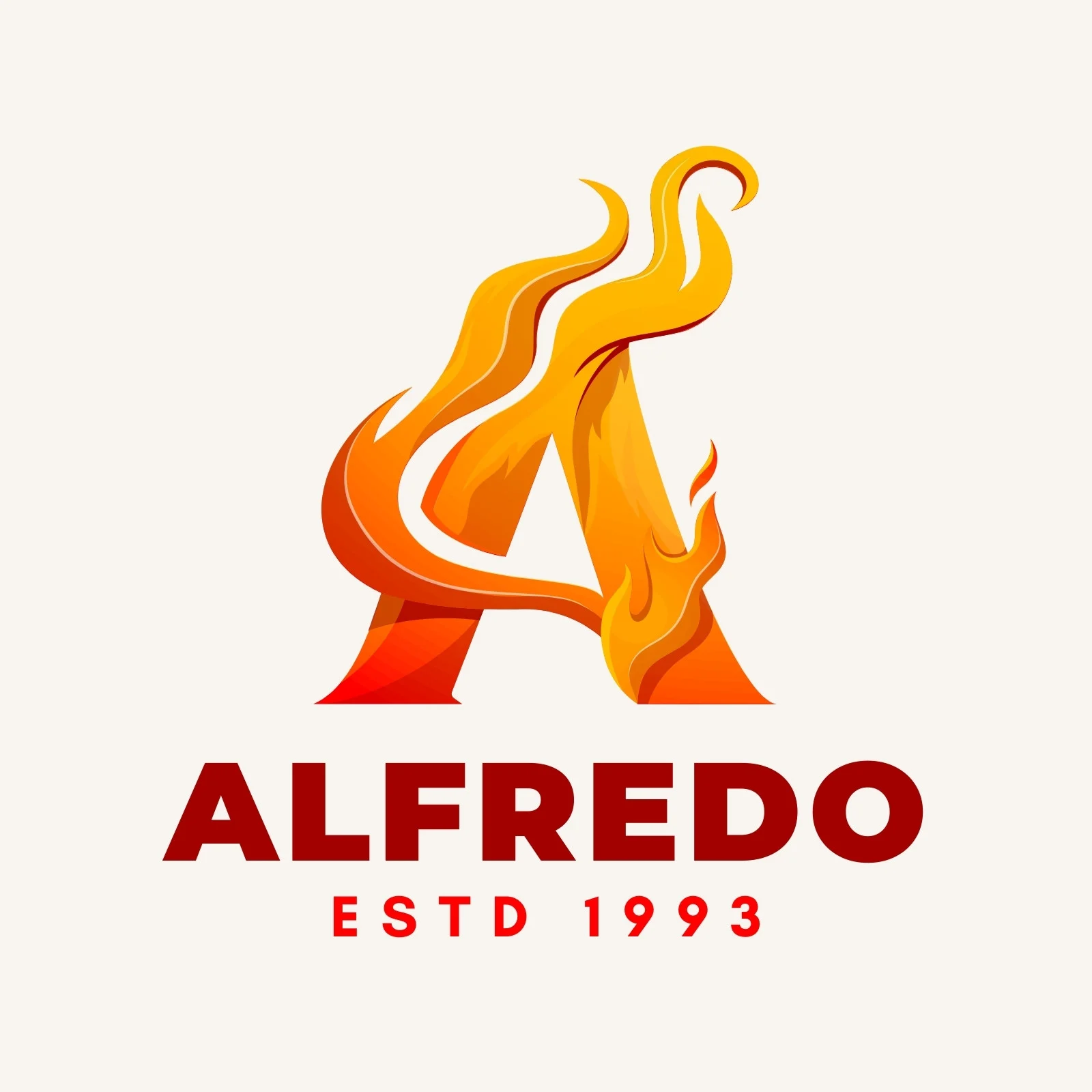 A vibrant and dynamic logo designed for Alfredo, using a stylized flaming 'A' to represent passion and energy. The warm gradient colors evoke strength, creativity, and movement.