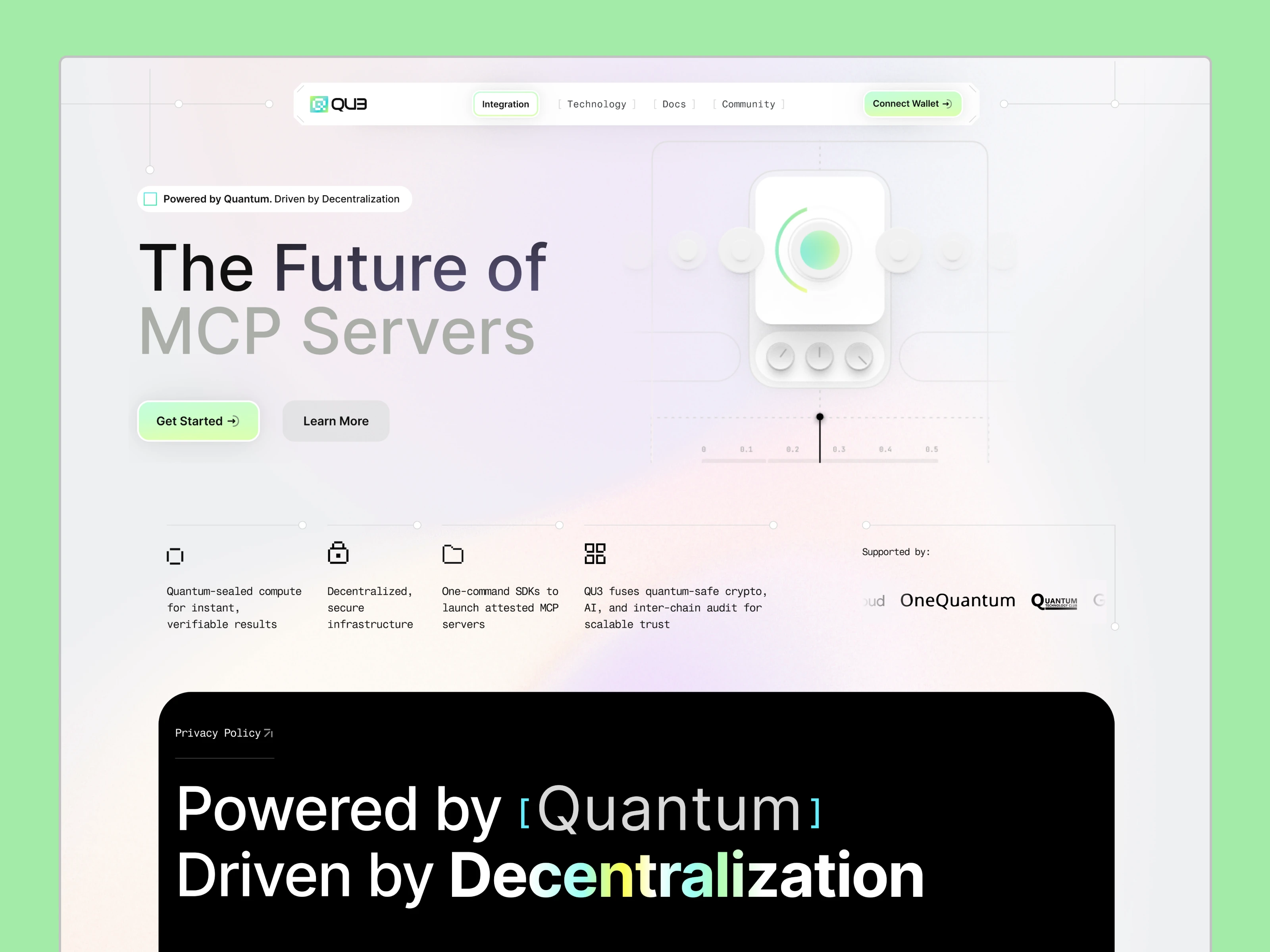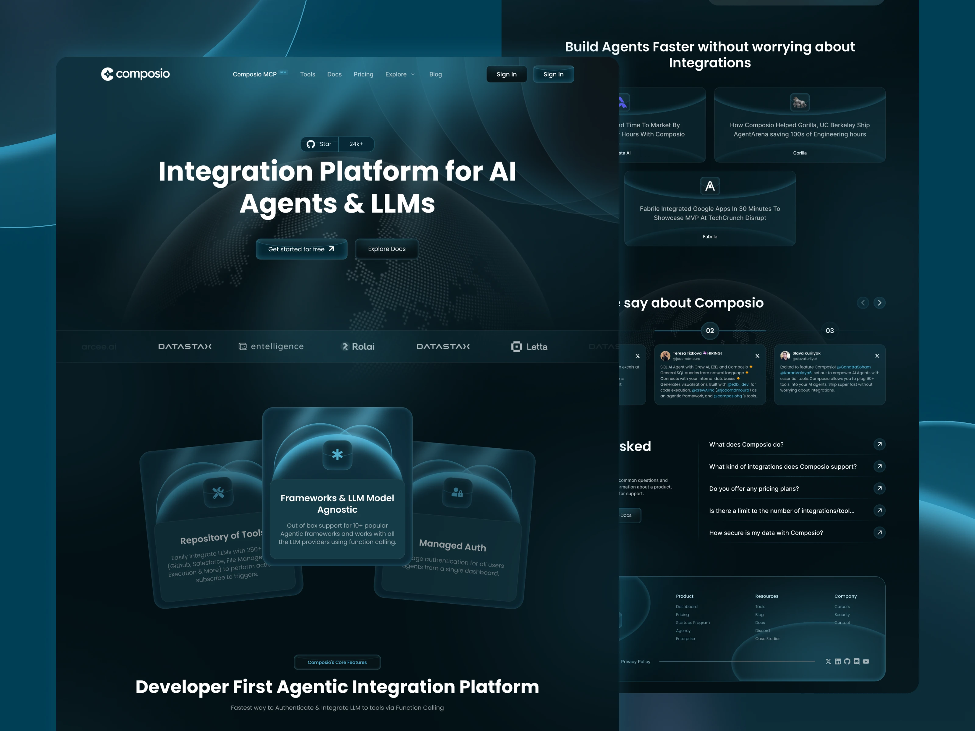 Dark-themed, futuristic web UI tailored for developers building AI agents. Highlights seamless integration, toolkits, LLM model agnosticism, and strong community credibility through testimonials and logos. Clean hierarchy and glowing UI elements reinforce its cutting-edge tech branding.